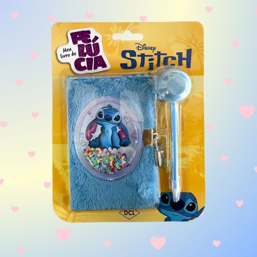 Livro peluciado com caneta decorada inspirada em Stitch Disney.