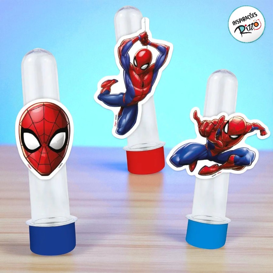 Mini Personagens Decorativos inspirados no Homem Aranha Marvel, ideais para deixar a decoração da festa cheia de ação e aventura. Com figuras em tamanhos variados, podem ser usados para personalizar lembrancinhas como tubetes e caixinhas de doces, além de enriquecer a mesa principal ou as mesas dos convidados com detalhes temáticos.