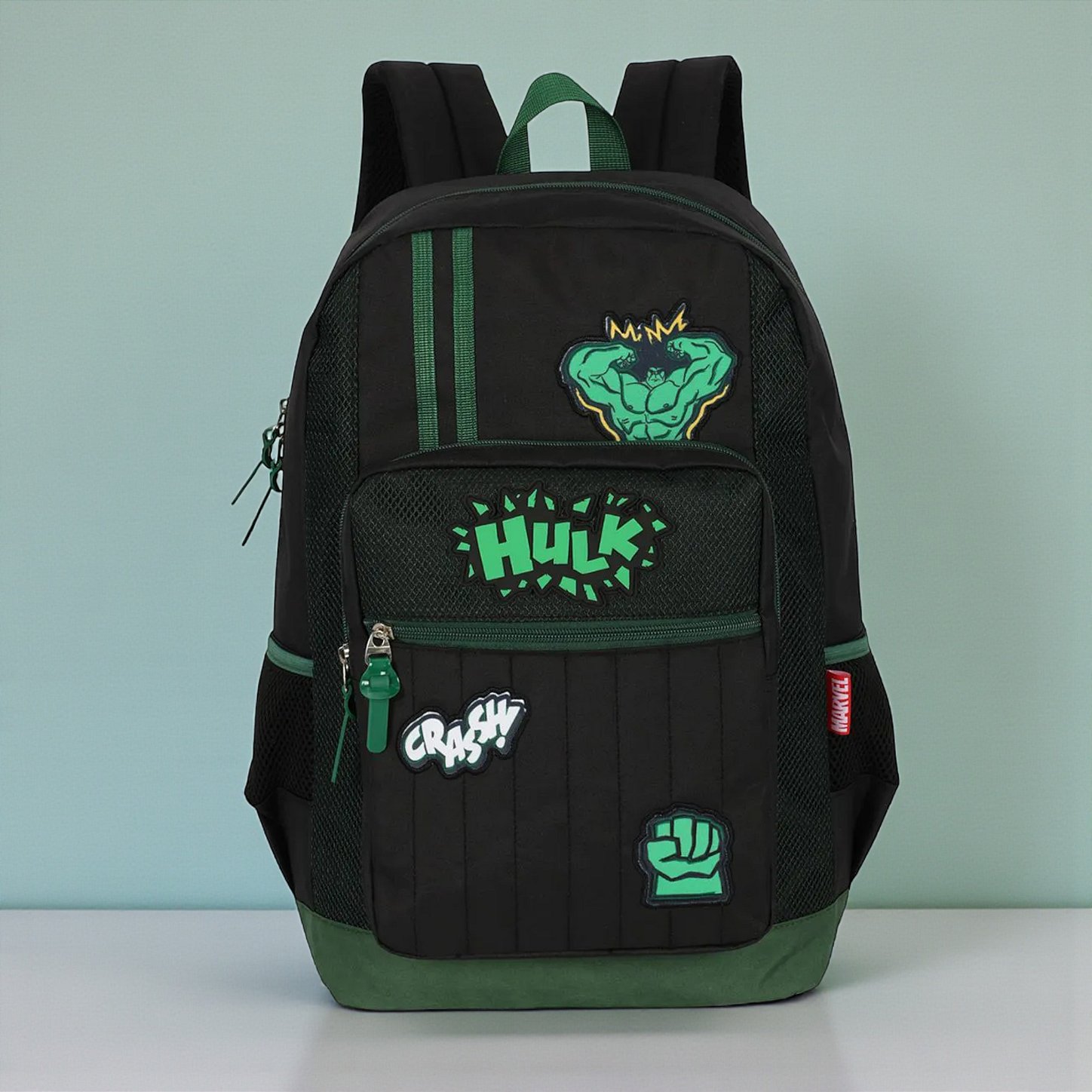 A Mochila Escolar – Hulk Disney chama atenção pelo visual forte inspirado no herói e pela utilidade na rotina escolar. O bolso principal com zíper duplo acomoda livros e cadernos de forma organizada, enquanto os dois bolsos frontais com zíper facilitam o acesso a itens menores. Os bolsos laterais são ideais para garrafas, contribuindo para o dia a dia na escola. Os detalhes bordados e emborrachados destacam o design temático, e a alça superior junto às alças de costas acolchoadas e ajustáveis completam a composição prática para estudos, passeios e volta às aulas.