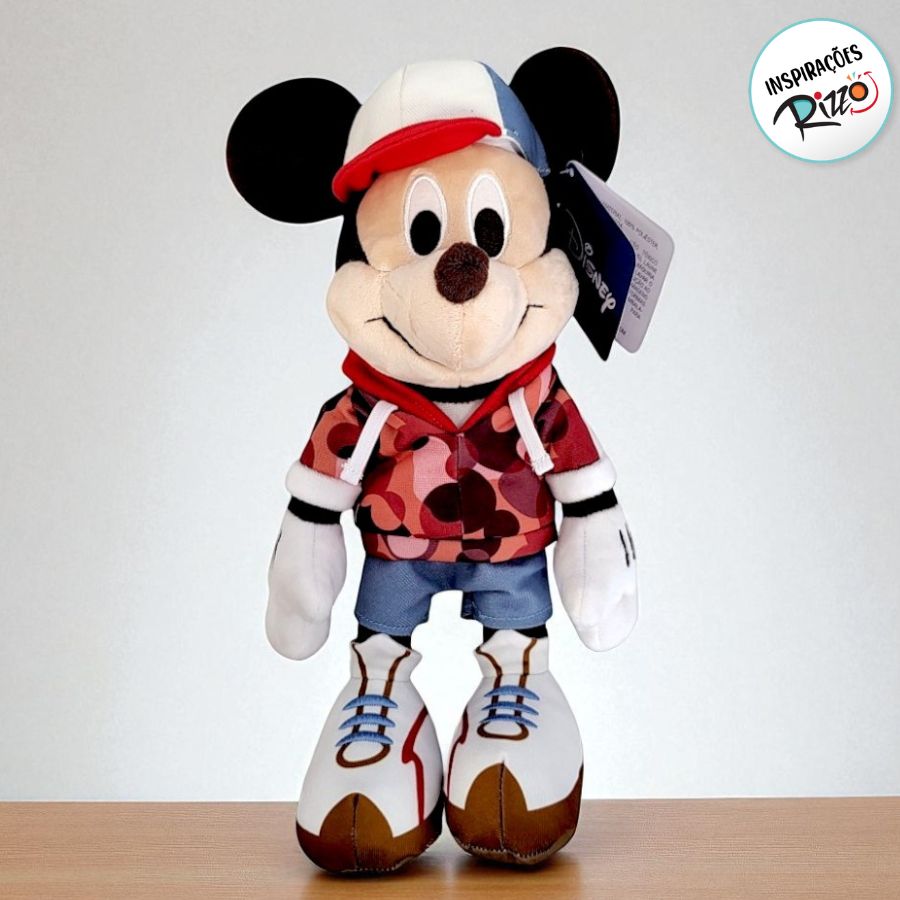 Sonhe, realize e comemore com a magia da Loja Disney! Inspirada no clássico Mickey Mouse Disney, esta pelúcia apresenta um moletom cheio de detalhes, bermuda estilosa, tênis e um boné super fofo, criando um visual moderno e divertido. Produto antialérgico e não tóxico, certificado com selo INNAC (COP 0061) e selo Inmetro (006 003/2021).