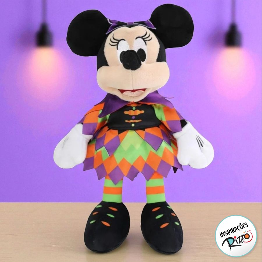 A decoração Minnie Halloween completa a mesa temática de festa Minnie, podendo ser combinada com outras pelúcias do mesmo personagem ou itens como picks decorativos, mini personagens e enfeites da mesa, criando um cenário harmonioso e divertido. Ideal para decorar quartos, festas Halloween Minnie ou como pelúcia para brincar.