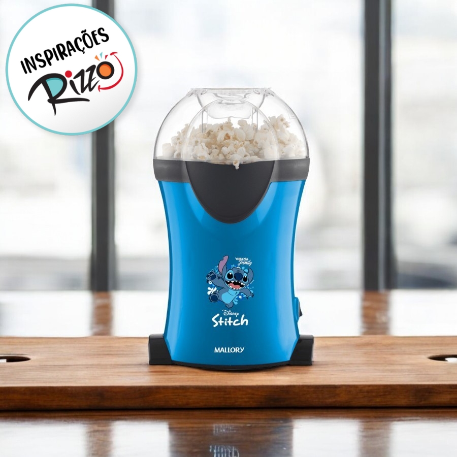 Contém uma pipoqueira azul do personagem Stitch com 28 centímetros de altura, 127 Volts e cabo de 90 centímetros