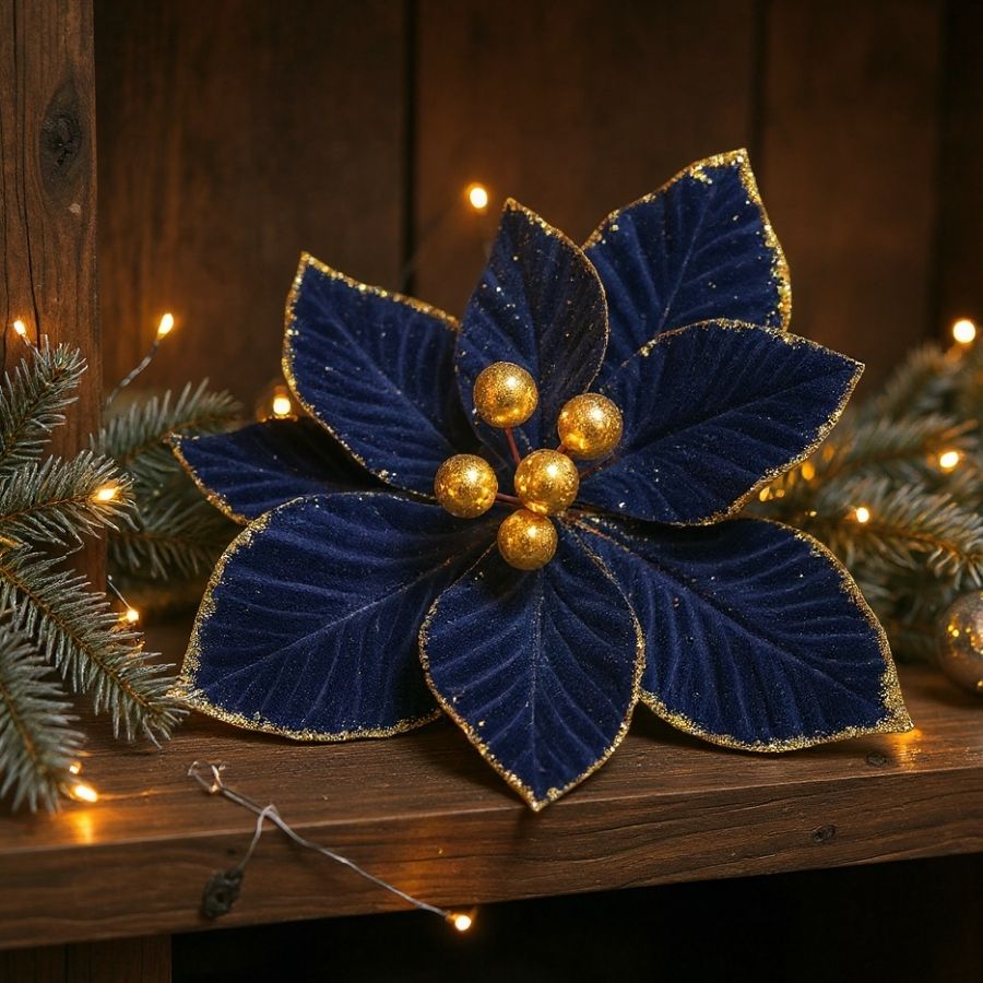 A Poinsétia Decorativa Azul Pastel/Dourado com Glitter é sofisticada, delicada e charmosa, ideal para valorizar decorações natalinas com brilho e estilo.