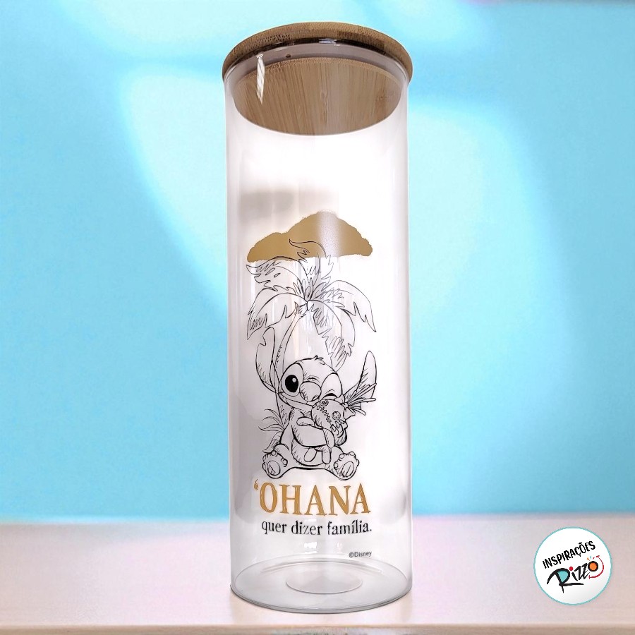 Pote de vidro, com tampa hermética de bambu, inspirado no personagem Stitch Disney.