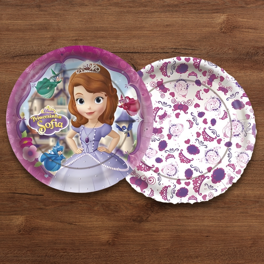 O Prato de Papel Sofia The First possui formato redondo e mede 18x18cm, sendo confeccionado em papel firme e de alta qualidade. Ideal para festas infantis temáticas da Princesa Sofia.