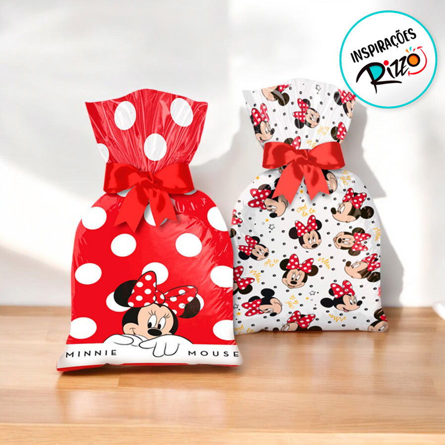 Sacola plástica temática da minnie mouse. Não acompanha acessórios para fechamentos, como fitas e fechos.