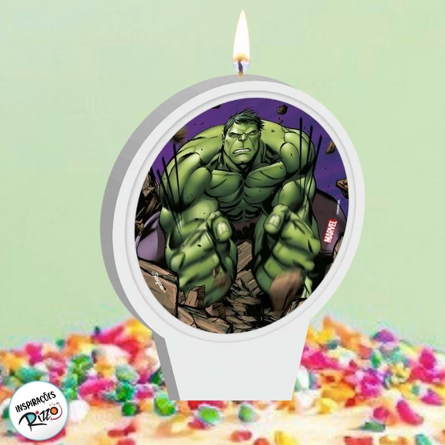 Vela Plana Adesivada inspirada no Hulk Marvel, ideal para deixar o topo do bolo ainda mais divertido e temático em festas de super-heróis. Apresenta imagem vibrante do personagem em adesivo de alta definição, aplicada sobre base plana, perfeita para complementar a decoração.